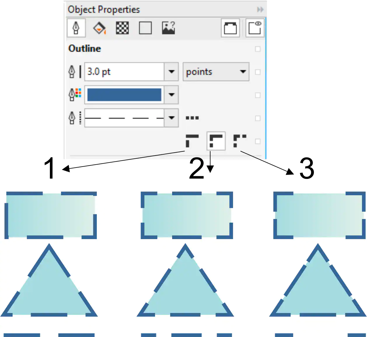 - The Align dashes option (2) aligns dashes with the end and corner points so that there is no empty space in the corners and at the start and end of a line or outline.