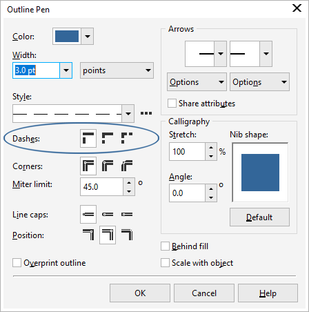NOTE: if you are using CorelDRAW 2019 or higher, you can find the dash options on the Outline tab in the Properties docker (Window menu > Dockers > Properties).