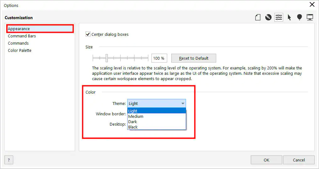 In the Options window, select Appearance from the list on the left. In the Color section, use the Theme dropdown list to choose from: the default Light theme, Medium, Dark, and Black.