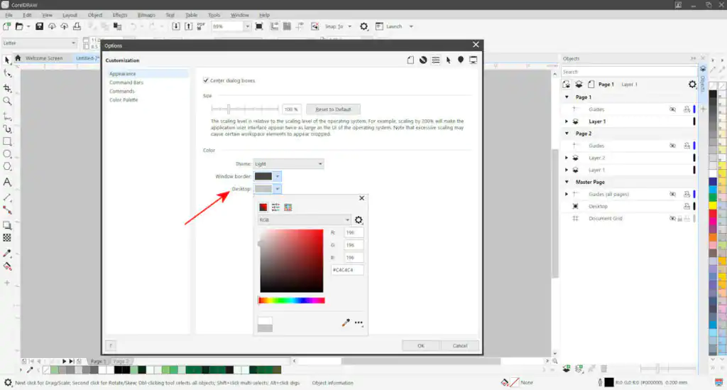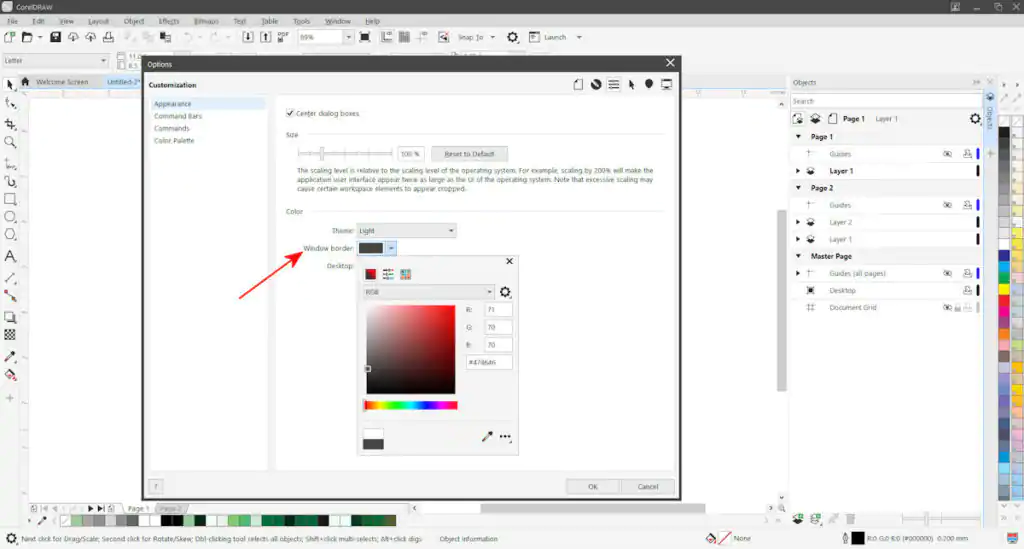 You can customize the appearance of the CorelDRAW User Interface (UI) by changing the theme, window border color and desktop color.