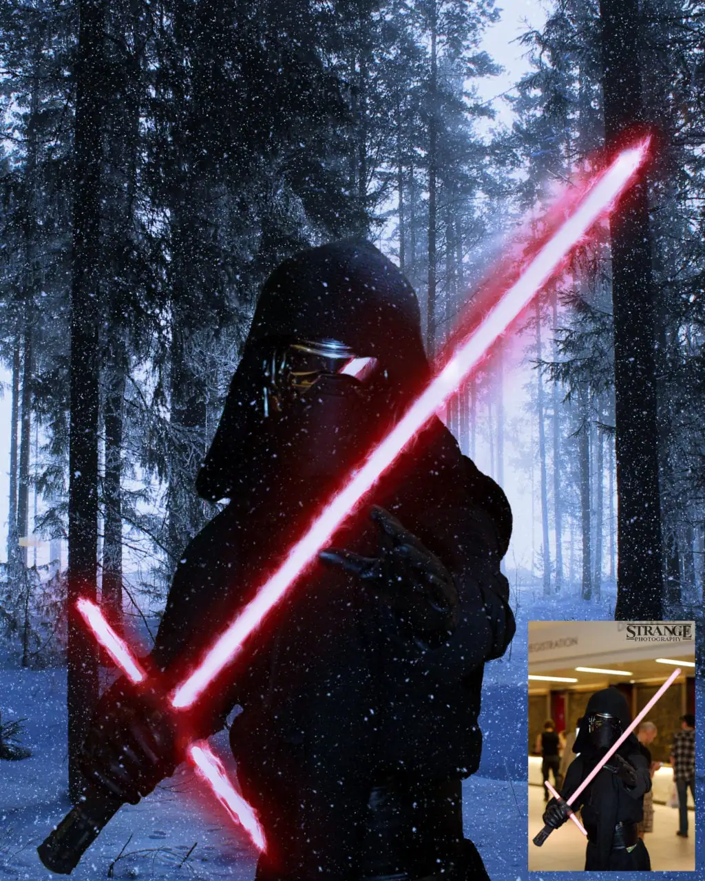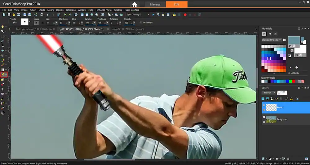 Use the Eraser tool to remove the part of the lightsaber that should be hidden by the hand, to make it look like your subject is actually holding it.