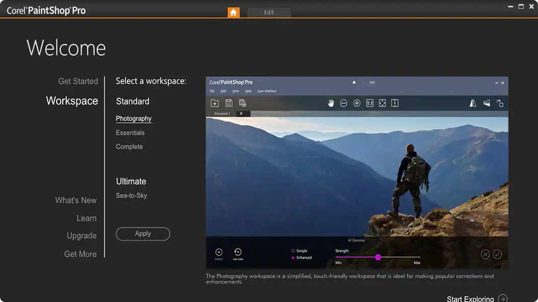 From one-click fixes to advanced photo editing, PaintShop® Pro 2022 makes it all happen faster with AI-powered features and time-saving enhancements. Imagined for all skill levels and designed with multiple workspaces, you’ll find it easy to navigate and accomplish whatever photo task you need. Complete your visual story with a collection of graphic design tools to paint, draw, add text or build composites with layers and masks. A positive experience from start to finish, you can produce results that are as unique as your images.